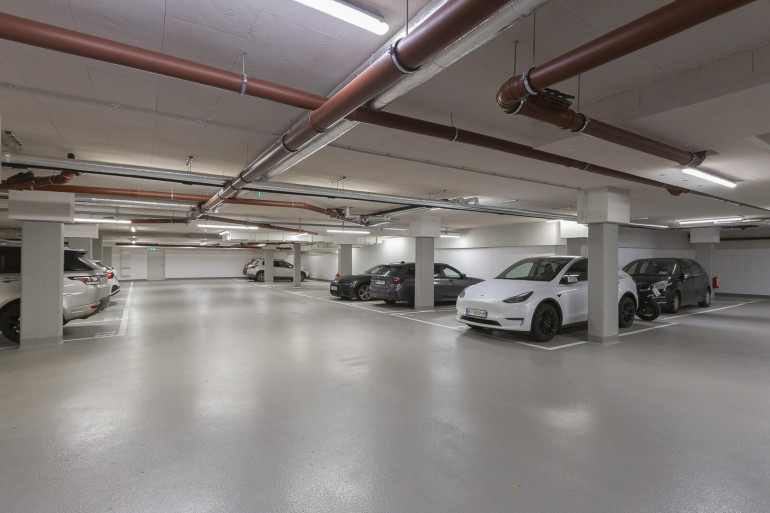 Parkett, Fliesen, Fernwärme, Fußbodenheizung, Wohnküche / offene Küche, Personenaufzug, Dusche, Badewanne, Garage