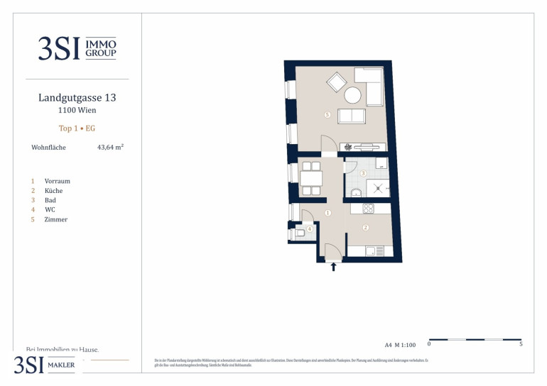 Diese teilmöblierte hofseitige 1-Zimmer-Wohnung befindet sich im Erdgeschoss und bietet auf rund 44 m² Wohnfläche eine kompakte und gut durchdachte Raumaufteilung: