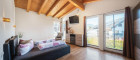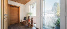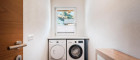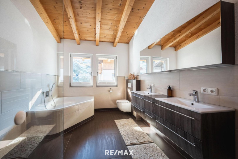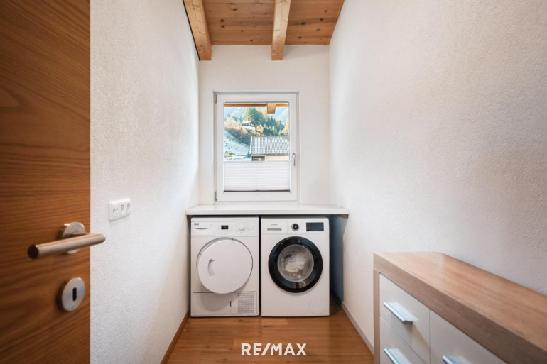 Das Obergeschoss überzeugt mit einem geräumigen Schlafzimmer, von dem aus Sie einen atemberaubenden Blick auf die umliegende Bergwelt genießen. Das moderne Badezimmer wurde als kleine Wellnessoase konzipiert und bietet mit Badewanne, Dusche, Doppelwaschtisch und WC höchsten Komfort. Ein separater Hauswirtschaftsraum mit Anschlüssen für Waschmaschine und Trockner sorgt für zusätzliche Bequemlichkeit im Alltag.