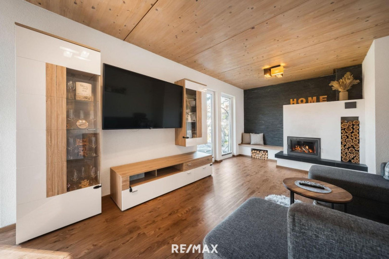 - Helles Wohnambiente mit Charme – Großzügiger Wohn- und Essbereich mit Sichtkamin und offener Designküche als Herzstück des Hauses.