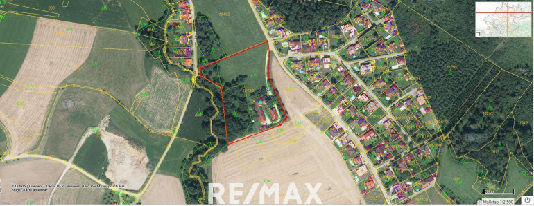 Das Anwesen besteht aus zwei Wohngebäuden, einer Scheune, Wald und Wiese und ist über eine eigene Zufahrtstraße erreichbar. Insgesamt umfasst die Liegenschaft ca. 17.808 m². Die Gesamtfläche teilt sich wie folgt auf: