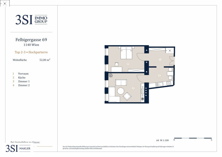 In der Felbigergasse 69 im 14. Wiener Gemeindebezirk gelangt diese ca. 52 m² große Wohnung (Top 2–3) im Hochparterre zum Verkauf. Die Wohnung verfügt über einen Vorraum, eine separate Küche sowie zwei Zimmer und bietet damit eine gut nutzbare und klassische Raumaufteilung.