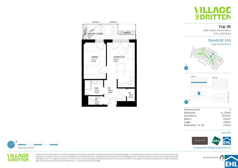 Im dritten Wiener Gemeindebezirk entsteht mit dem VILLAGE IM DRITTEN ein neues Stück Stadt – eines der größten Stadtentwicklungsgebiete Wiens. Auf über elf Hektar entwickelt die ARE Austrian Real Estate gemeinsam mit der Stadt Wien und dem wohnfonds_wien ein lebendiges, nahezu autofreies Quartier mit rund 2.000 Wohnungen, Büro- und Gewerbeflächen, Kinderbetreuung, Bildungseinrichtungen und Nahversorgung. Das grüne Herz bildet der über 2 Hektar große Bert-Brecht-Park –eine Oase für Erholung, Begegnung und Spiel. Alle Dächer, die nicht begehbar sind, werden begrünt. Sharing-Angebote, Einkaufsmöglichkeiten und Gastronomie liegen direkt vor der Haustüre. Nachhaltigkeit, kurze Wege und hohe Lebensqualität sind die Leitlinien dieses neuen Stadtviertels.