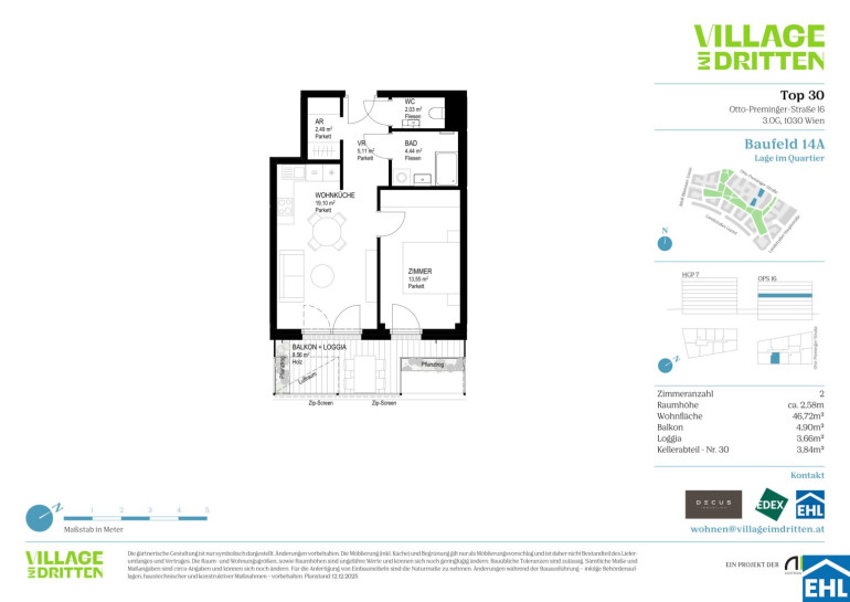 Im dritten Wiener Gemeindebezirk entsteht mit dem VILLAGE IM DRITTEN ein neues Stück Stadt – eines der größten Stadtentwicklungsgebiete Wiens. Auf über elf Hektar entwickelt die ARE Austrian Real Estate gemeinsam mit der Stadt Wien und dem wohnfonds_wien ein lebendiges, nahezu autofreies Quartier mit rund 2.000 Wohnungen, Büro- und Gewerbeflächen, Kinderbetreuung, Bildungseinrichtungen und Nahversorgung. Das grüne Herz bildet der über 2 Hektar große Bert-Brecht-Park –eine Oase für Erholung, Begegnung und Spiel. Alle Dächer, die nicht begehbar sind, werden begrünt. Sharing-Angebote, Einkaufsmöglichkeiten und Gastronomie liegen direkt vor der Haustüre. Nachhaltigkeit, kurze Wege und hohe Lebensqualität sind die Leitlinien dieses neuen Stadtviertels.