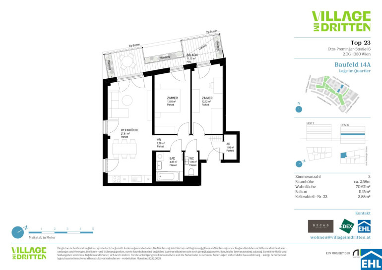 Im dritten Wiener Gemeindebezirk entsteht mit dem VILLAGE IM DRITTEN ein neues Stück Stadt – eines der größten Stadtentwicklungsgebiete Wiens. Auf über elf Hektar entwickelt die ARE Austrian Real Estate gemeinsam mit der Stadt Wien und dem wohnfonds_wien ein lebendiges, nahezu autofreies Quartier mit rund 2.000 Wohnungen, Büro- und Gewerbeflächen, Kinderbetreuung, Bildungseinrichtungen und Nahversorgung. Das grüne Herz bildet der über 2 Hektar große Bert-Brecht-Park –eine Oase für Erholung, Begegnung und Spiel. Alle Dächer, die nicht begehbar sind, werden begrünt. Sharing-Angebote, Einkaufsmöglichkeiten und Gastronomie liegen direkt vor der Haustüre. Nachhaltigkeit, kurze Wege und hohe Lebensqualität sind die Leitlinien dieses neuen Stadtviertels.