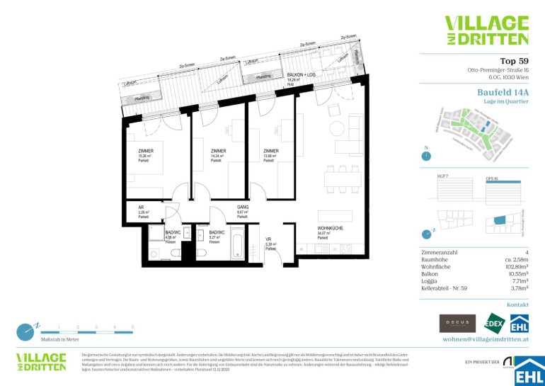 Im dritten Wiener Gemeindebezirk entsteht mit dem VILLAGE IM DRITTEN ein neues Stück Stadt – eines der größten Stadtentwicklungsgebiete Wiens. Auf über elf Hektar entwickelt die ARE Austrian Real Estate gemeinsam mit der Stadt Wien und dem wohnfonds_wien ein lebendiges, nahezu autofreies Quartier mit rund 2.000 Wohnungen, Büro- und Gewerbeflächen, Kinderbetreuung, Bildungseinrichtungen und Nahversorgung. Das grüne Herz bildet der über 2 Hektar große Bert-Brecht-Park –eine Oase für Erholung, Begegnung und Spiel. Alle Dächer, die nicht begehbar sind, werden begrünt. Sharing-Angebote, Einkaufsmöglichkeiten und Gastronomie liegen direkt vor der Haustüre. Nachhaltigkeit, kurze Wege und hohe Lebensqualität sind die Leitlinien dieses neuen Stadtviertels.