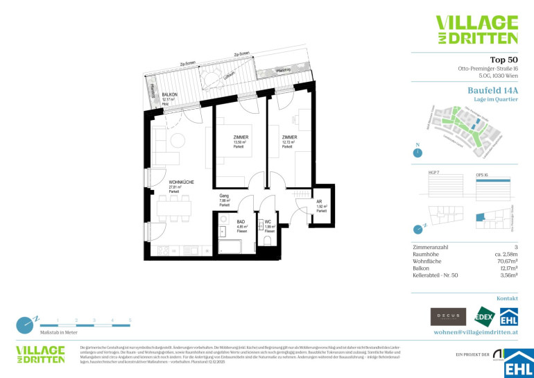 Im dritten Wiener Gemeindebezirk entsteht mit dem VILLAGE IM DRITTEN ein neues Stück Stadt – eines der größten Stadtentwicklungsgebiete Wiens. Auf über elf Hektar entwickelt die ARE Austrian Real Estate gemeinsam mit der Stadt Wien und dem wohnfonds_wien ein lebendiges, nahezu autofreies Quartier mit rund 2.000 Wohnungen, Büro- und Gewerbeflächen, Kinderbetreuung, Bildungseinrichtungen und Nahversorgung. Das grüne Herz bildet der über 2 Hektar große Bert-Brecht-Park –eine Oase für Erholung, Begegnung und Spiel. Alle Dächer, die nicht begehbar sind, werden begrünt. Sharing-Angebote, Einkaufsmöglichkeiten und Gastronomie liegen direkt vor der Haustüre. Nachhaltigkeit, kurze Wege und hohe Lebensqualität sind die Leitlinien dieses neuen Stadtviertels.