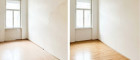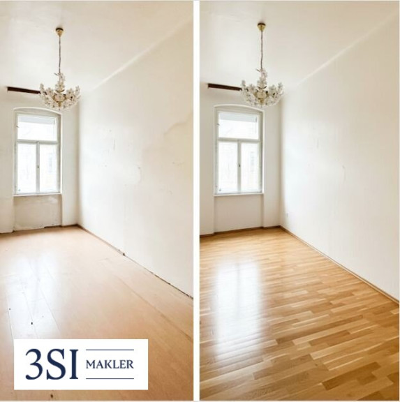 Das Titelbild vermittelt einen Eindruck vom aktuellen Zustand der Wohnung und zeigt zugleich, wie sie nach einer umfassenden Sanierung aussehen könnte.