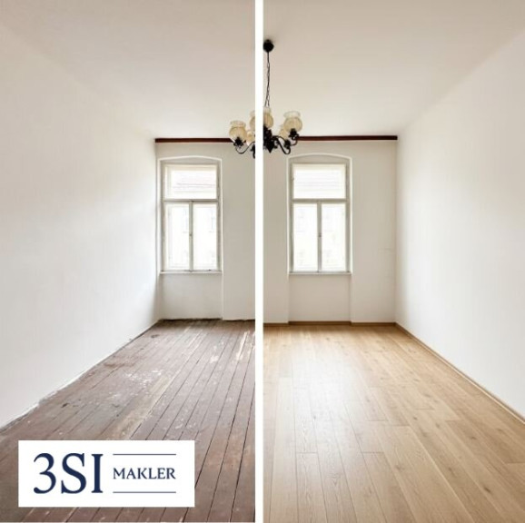 Das Titelbild vermittelt einen Eindruck vom aktuellen Zustand der Wohnung und zeigt zugleich, wie sie nach einer umfassenden Sanierung aussehen könnte.