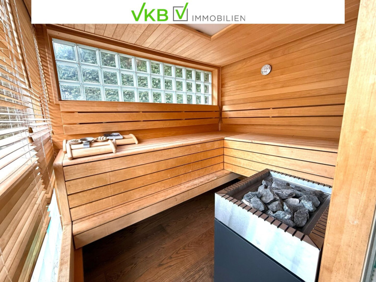 Der großzügige Garten mit Pool und Saunahaus bietet einen privaten Rückzugsort für entspannte Stunden – zu jeder Jahreszeit.