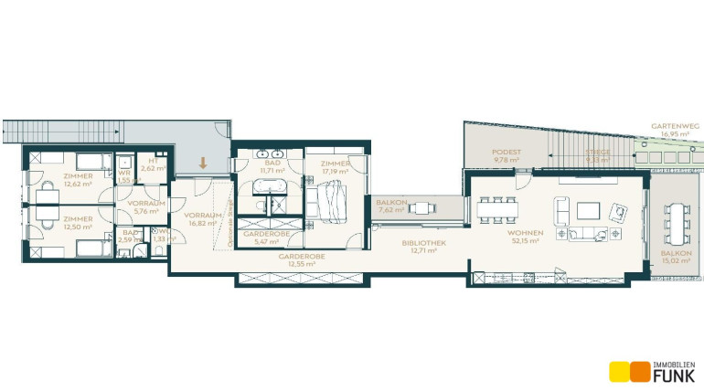 Dieses großzügige Appartement liegt im Obergeschoss des linken der drei Häuser und bietet Ihnen eine Wohnfläche von ca. 167 m². Sie betreten die Wohnung über einen Vorraum, der ausreichend Platz für die Garderobe bietet. Rechter Hand des Vorraums erwarten Sie zwei Schlafzimmer, ein Bad mit Dusche, WC und Handwaschbecken sowie der Technik- und Wirtschaftsraum und die Gästetoilette. Linker Hand des Vorraums gelangen Sie zum Masterbedroom mit Garderobe und en-Suite Bad, ausgestattet mit Dusche, Wanne, WC und Doppelwaschtisch. Vor dem Wohnbereich öffnet sich der Gang mit Schiebetür zu einem Balkon mit ca. 7 m² Fläche. Anschließend daran bietet Ihnen die ca. 52 m² große Wohnküche mit Zugang zu einem ca. 15 m² großen Balkon eine herrliche Aussicht auf den Neufelder See. Eine private Stiege führt Sie vom Wohnbereich über einen kurzen Gartenweg direkt zum See.