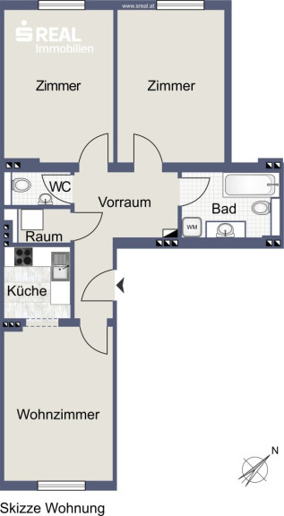 Sie gliedert sich in einen zentralen Vorraum, Wohnzimmer mit offener Küche, 2 Schlafzimmer, Bad mit Toilette und Waschmaschinenanschluss, Abstellraum und ist mit Parkettboden, Kunststofffenstern mit Außenjalousien und Gasetagenheizung/ Brennwertkessel ausgestattet.