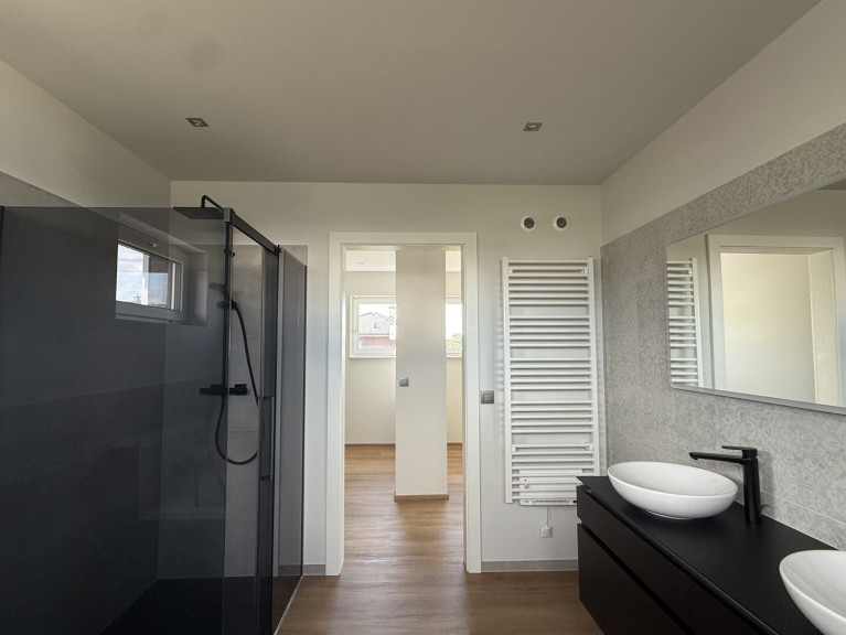 - Master Schlafzimmer mit begehbarem Schrankraum und Zugang zum Master Bad mit Eckbadewanne, Dusche, Doppelhandwaschbecken und WC