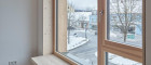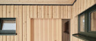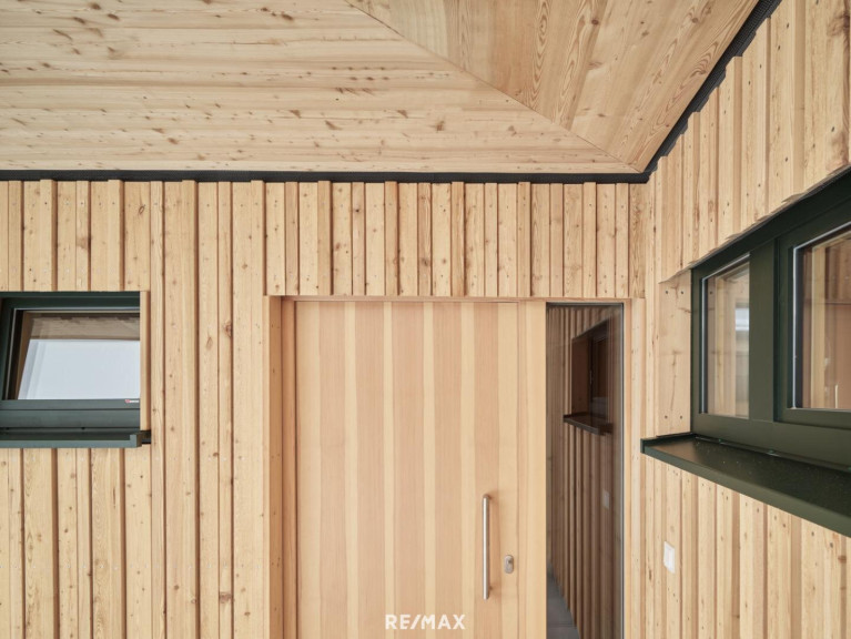 Materialeinsatz und verleiht dem Gebäude seine natürliche, zeitlose Ästhetik. Großzügige Fensterflächen, klare Linien und sichtbar belassene Holzstrukturen prägen die Identität des Hauses.