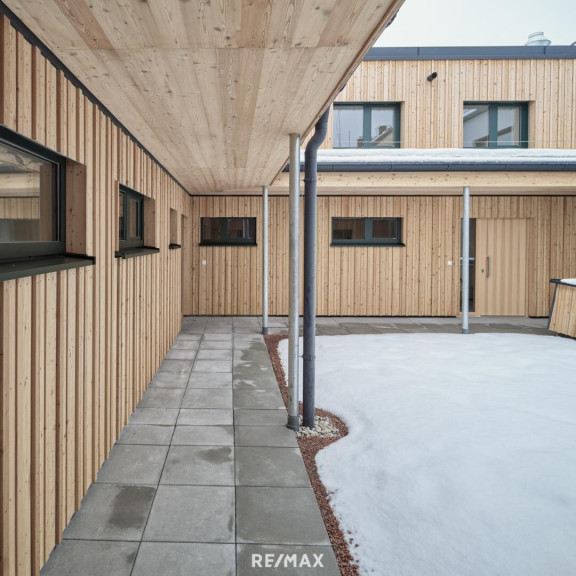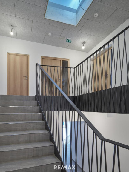 entsteht damit eine verlässliche Basis, die langfristige Stabilität und geringe Volatilität gewährleistet.Die Innenräume sind hell, transparent strukturiert und hochwertig gestaltet. Eine elegant proportionierte Treppenanlage, viel Tageslicht und die ruhige Materialwahl prägen die Atmosphäre. Der geschützte Innenhof mit seinen Holzfassaden stärkt das harmonische Gesamtbild und bietet zusätzliche Aufenthaltsqualität.