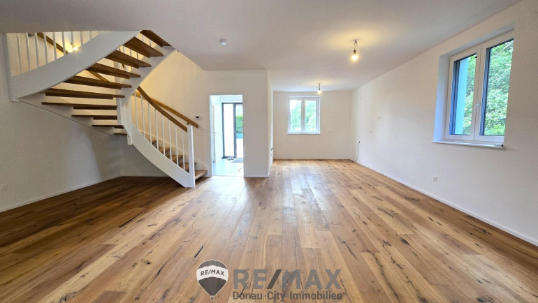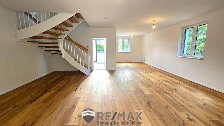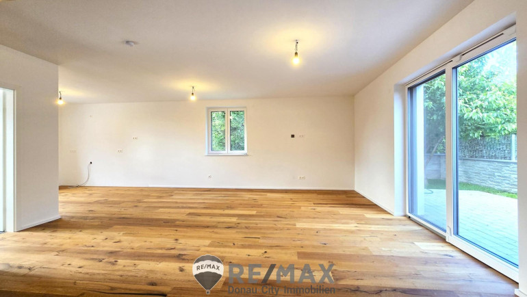 Von hier aus gelangen Sie direkt auf die große Terrasse mit kleinem, pflegeleichtem Garten – ideal zum Entspannen.