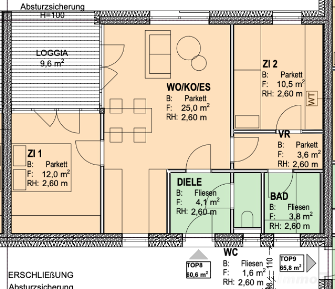 Die Top 8 teilt sich wie folgt auf: Diele, Bad, WC, Wohn/Kochen/Essen mit ca. 25 m2 und Zugang zur Loggia, sowie 2 extra Zimmer.