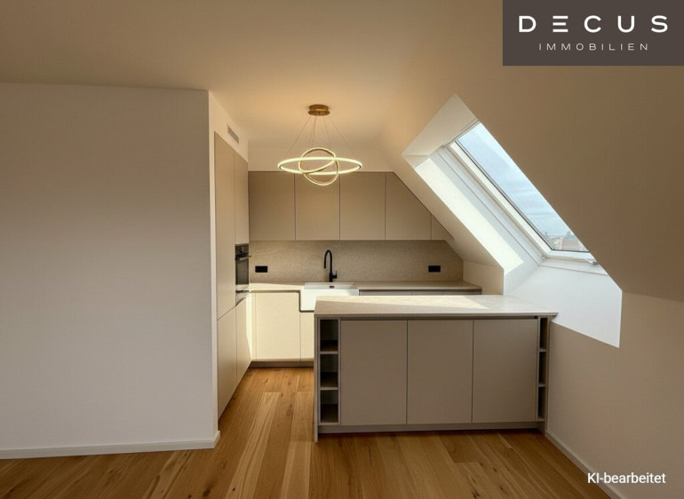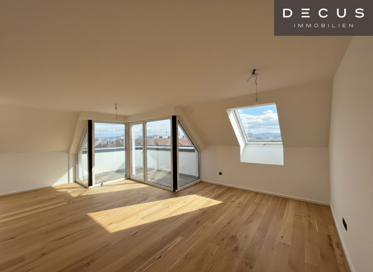 Der offen gestaltete Wohn- und Essbereich präsentiert sich hell, großzügig und einladend. Von hier aus ist die erste Terrasse direkt begehbar, die den Wohnraum harmonisch nach außen erweitert und einen beeindruckenden Ausblick in Richtung Gloriette bietet – ein besonderes Highlight, das dem Wohnen im Dachgeschoss eine außergewöhnliche Atmosphäre verleiht.