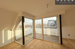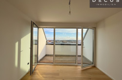 Der offen gestaltete Wohn- und Essbereich präsentiert sich hell, großzügig und einladend. Von hier aus ist die erste Terrasse direkt begehbar, die den Wohnraum harmonisch nach außen erweitert und einen beeindruckenden Ausblick in Richtung Gloriette bietet – ein besonderes Highlight, das dem Wohnen im Dachgeschoss eine außergewöhnliche Atmosphäre verleiht.