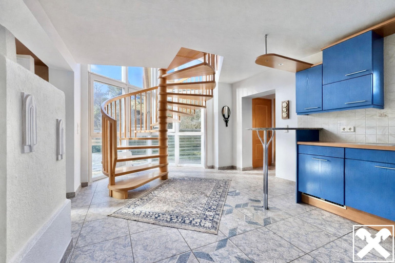 Über den einladenden Garderobenbereich ist der großzügige Wohn-, Ess- und Kochbereich begehbar. Die offene Gestaltung schafft eine angenehme Großzügigkeit. Der Wohnbereich beherbergt einen behaglichen Kachelofen. Eine große Glasfront sorgt für eine lichtdurchflutete Atmosphäre. Von hier aus ist die überdachte Terrasse begehbar, auf der entspannte Stunden im Freien genossen werden können. Der Garten wurde mit viel Liebe und Sorgfalt gepflegt.