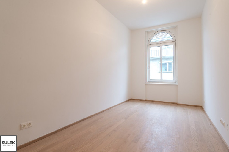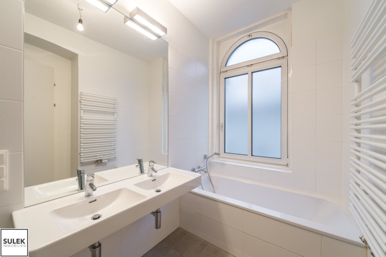 Diese Dachgeschoss - Wohnung ist im 4. Stock eines durchgreifend sanierten Altbaus mit Stilfassade gelegen und wird über einen zentralen Vorraum betreten. Vom Vorraum aus erreichen Sie 2 ident Große große Schlafzimmer, ein Badezimmer mit Wanne und Toilette, sowie eine Gästetoilette mit Handwaschbecken.
