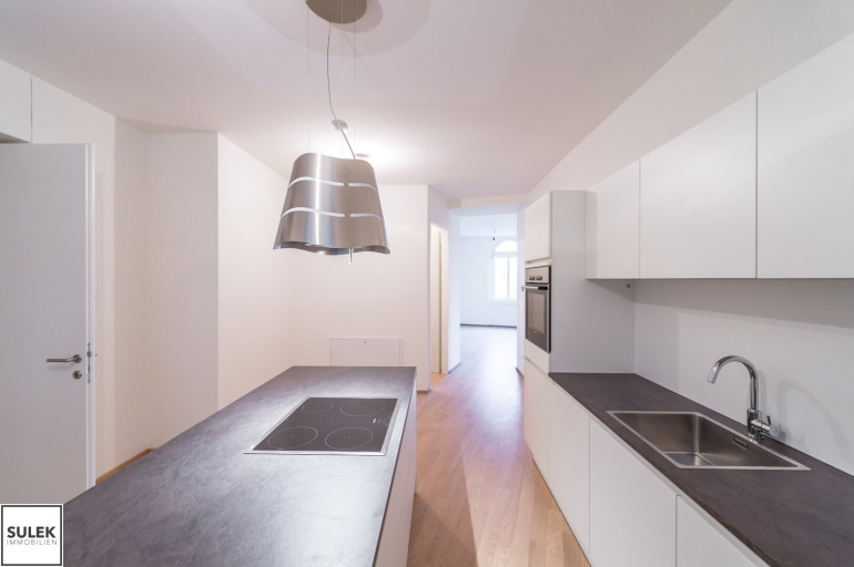Über die Küche gelangen Sie zum knapp 40m2 großen Ess- und Wohnbereich, welcher einen schönen Ausblick über den Wienfluss auf den 1. Bezirk und auf die Turmspitze des Stephansdom bietet.