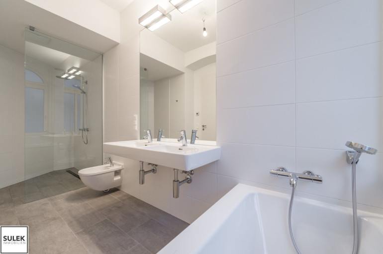 Vom Wohnraum aus gelangen Sie zum Master-Bedroom mit en-Suite Badezimmer, welches über eine Badewanne, eine 2-Personen-Dusche, ein Doppelwaschbecken und eine Toilette verfügt. Auch aus diesem Zimmer genießen Sie den Ausblick über den Wienfluss.