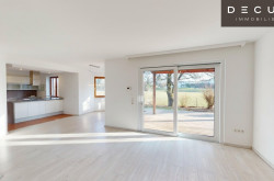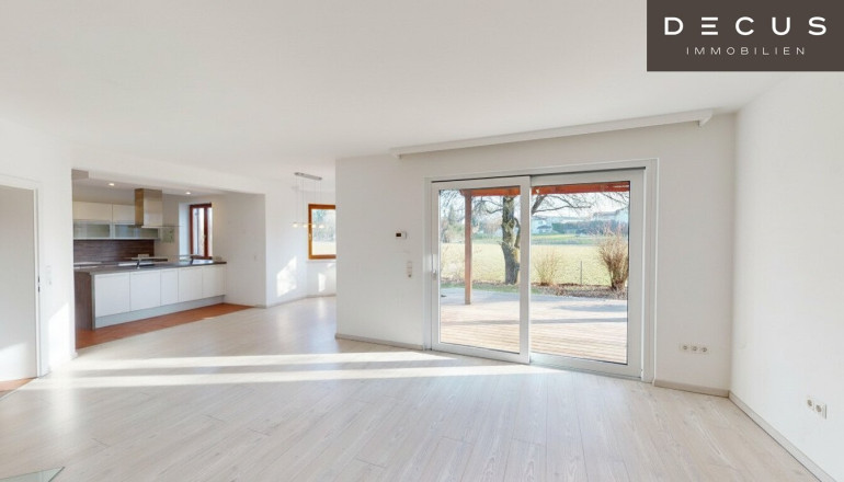 Der lichtdurchflutete Wohnbereich öffnet sich Richtung Garten und Terrasse und profitiert von der optimalen südseitigen Ausrichtung. Der freie Blick ins Grüne unterstreicht die besondere Wohnqualität und sorgt für Ruhe und Erholung – fernab von Durchzugsverkehr und Alltagshektik.