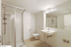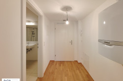 Direkt angrenzend befindet sich das Badezimmer, ausgestattet mit Dusche, WC und Waschmaschinenanschluss – kompakt, modern und praktisch zugleich.