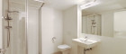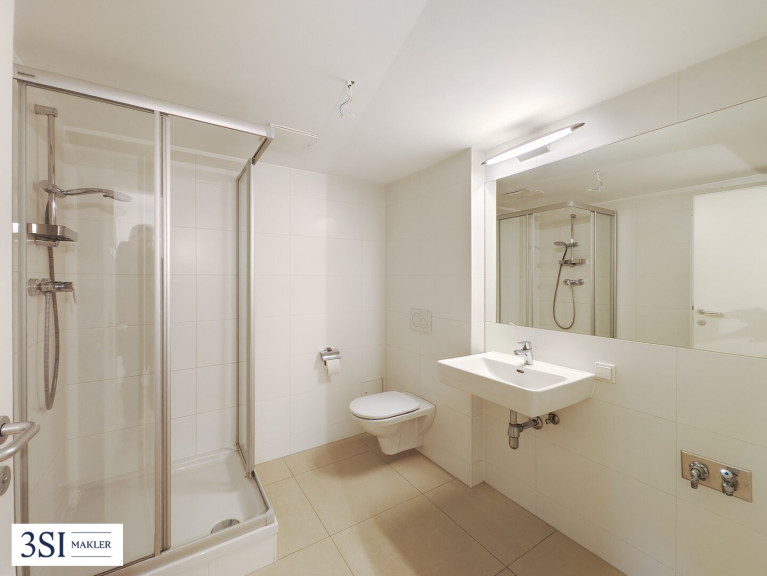 Direkt angrenzend befindet sich das Badezimmer, ausgestattet mit Dusche, WC und Waschmaschinenanschluss – kompakt, modern und praktisch zugleich.