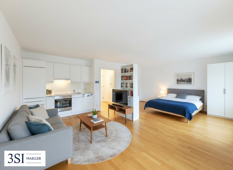 Der Wohn-/Ess- und Schlafbereich ist clever gestaltet und bietet alles, was man für komfortables Wohnen benötigt – ideal für Singles oder als stilvolles City-Apartment.