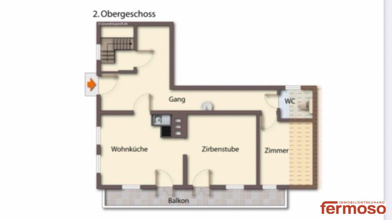 Vom 1. Obergeschoss gelangt man ins 2. Obergeschoss, welches auch über einen eigenen Eingangsbereich von aussen erreichbar ist. Dies ermöglicht eine Nutzung für die Privatzimmervermietung. Die Wohnnutzfläche beträgt ebenfalls ca. 62m2 und umfasst: