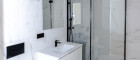Die moderne Küchenzeile ist mit einem Induktionskochfeld, einer Mikrowelle mit Backofenfunktion, einem Kühlschrank sowie einer Design-Spüle mit stilvollen schwarzen Armaturen ausgestattet.