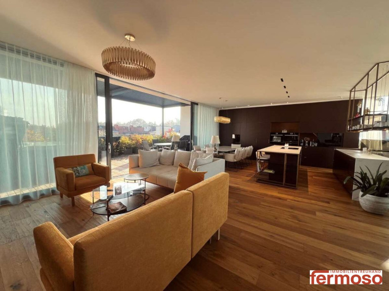 Der weitläufige Living Area mit offener Designer-Wohnküche bildet das Herzstück dieses Penthouses. Hier treffen Eleganz und Funktionalität aufeinander – ein Raum, der geschaffen wurde für Menschen, die das Besondere lieben. Für lange Abende mit Freunden. Für ruhige Momente mit Ausblick. Für Lifestyle auf höchstem Niveau.
