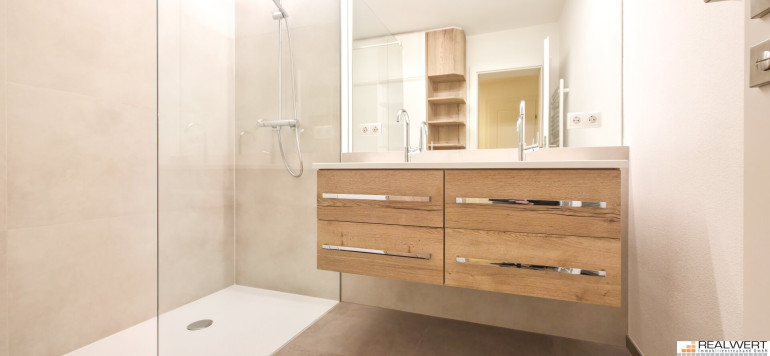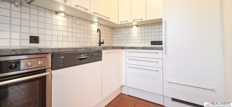 Fliesen, Laminatboden, Gas, Fußbodenheizung, Zentralheizung, Einbauküche, Personenaufzug, Südbalkon, Dusche, Kabel/Satelliten-TV, Parkplatz