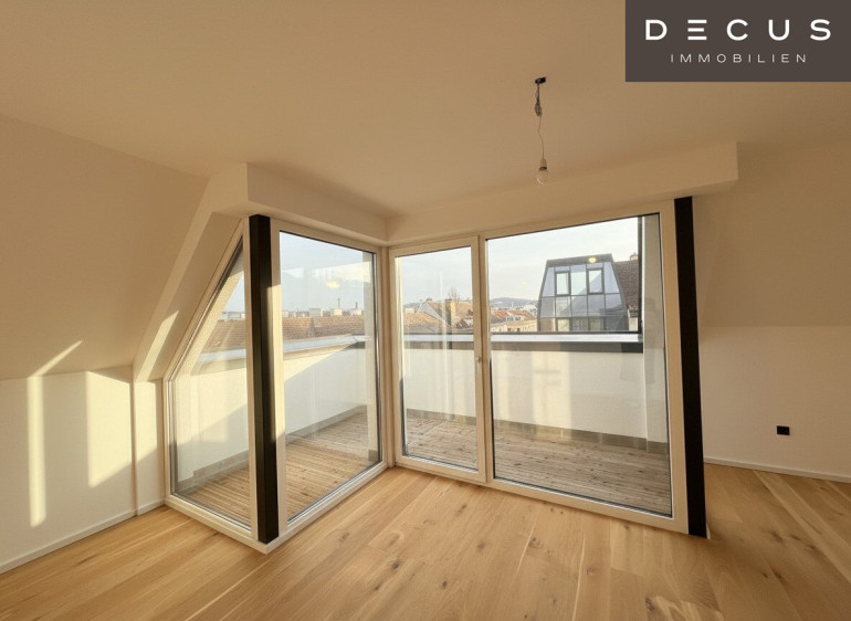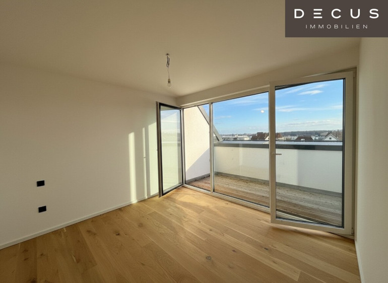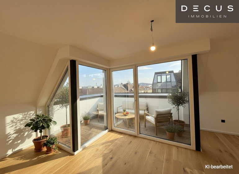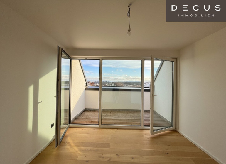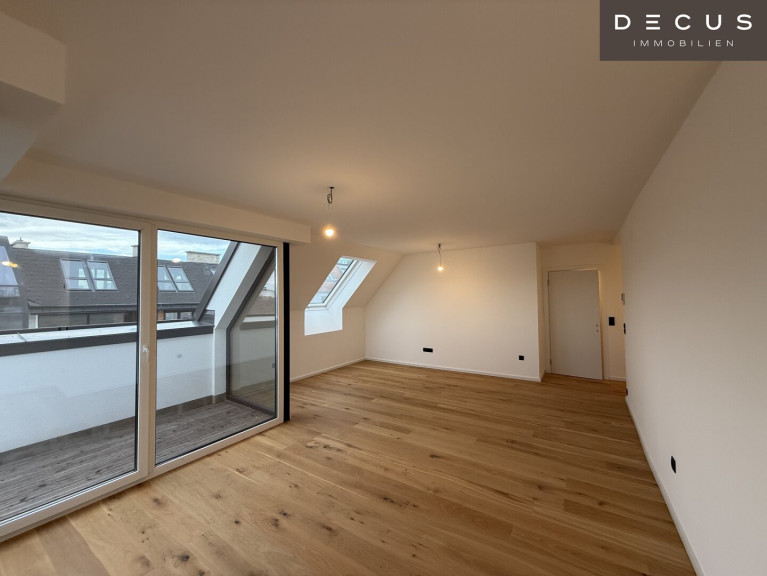 Der offen gestaltete Wohn- und Essbereich präsentiert sich hell, großzügig und einladend. Von hier aus ist die erste Terrasse direkt begehbar, die den Wohnraum harmonisch nach außen erweitert und einen beeindruckenden Ausblick in Richtung Gloriette bietet – ein besonderes Highlight, das dem Wohnen im Dachgeschoss eine außergewöhnliche Atmosphäre verleiht.