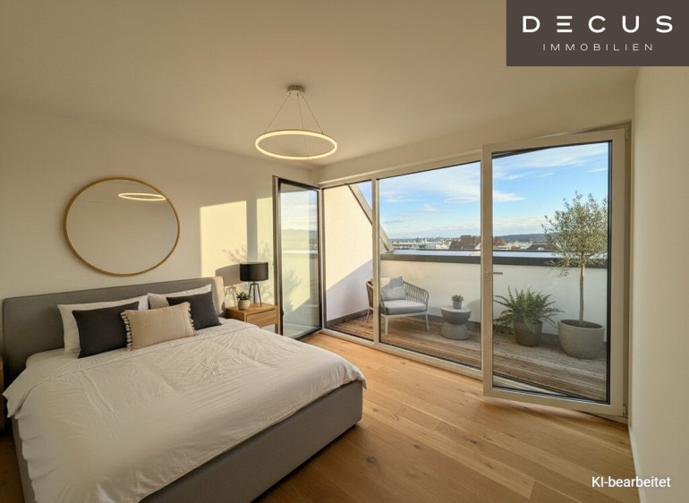Diese außergewöhnlich schöne 2-Zimmer-Dachgeschosswohnung vereint modernes Wohngefühl, hochwertige Ausstattung und seltene Freiflächen zu einem besonders stimmigen Zuhause. Zwei Terrassen – jeweils dem Wohn- und dem Schlafbereich zugeordnet – verleihen der Wohnung ein hohes Maß an Privatsphäre und Wohnqualität.