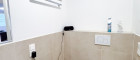 - ein Badezimmer mit Dusche, Toilette und Fenster