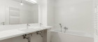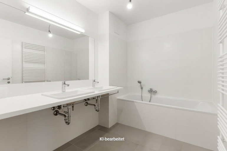 Das moderne Badezimmer mit Badewanne, Doppelwaschbecken und Waschmaschinenanschluss lädt zum Entspannen ein. Das separate WC sorgt für zusätzlichen Komfort im Alltag.