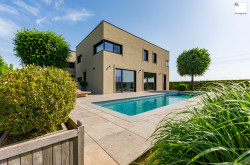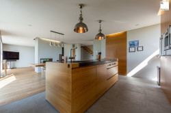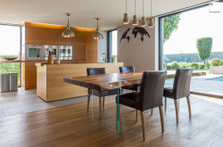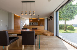 Ein einladender Eingangsbereich mit freier Sichtachse in den Garten eröffnet den Wohnbereich. Die offene Architektur und großflächige Verglasungen schaffen ein helles, großzügiges Raumgefühl. Der stilvolle Wohn-/Essbereich (ca. 55 m²) lädt mit einem doppelseitigen Sichtkamin zu geselligen Abenden oder entspannten Stunden ein. Eine moderne Küche fügt sich nahtlos ins offene Raumkonzept ein. Ebenfalls vorhanden: ein separates WC, Abstellraum und Zugang zur Doppelgarage.