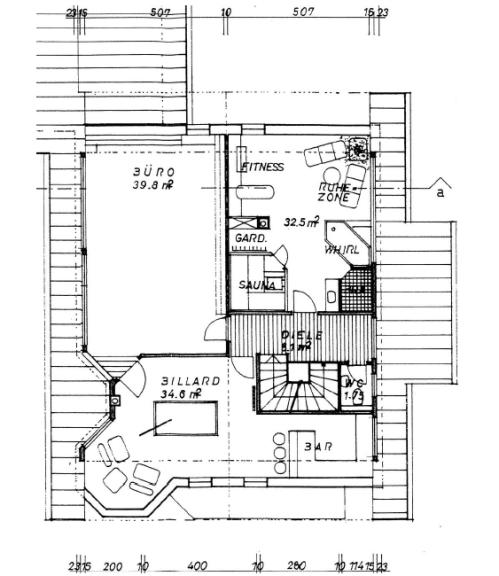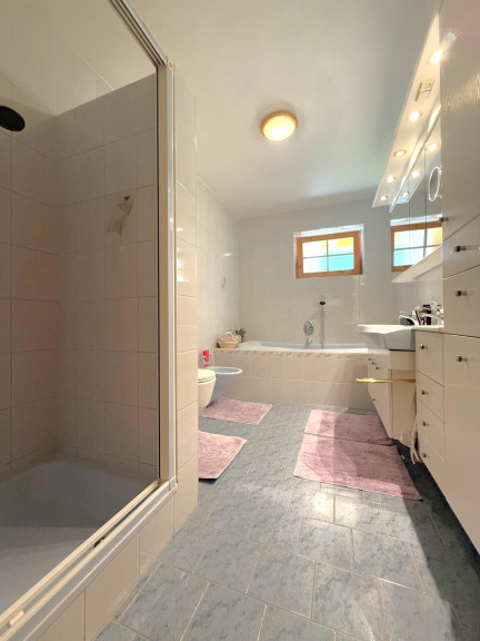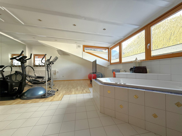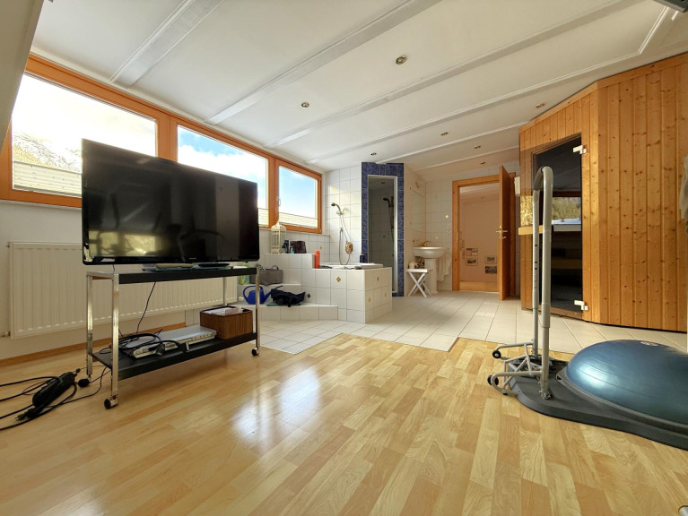 Zusätzlich steht auf dieser Ebene ein separater Wellnessbereich zur Verfügung, ausgestattet mit Sauna, großzügiger Dusche, Whirlpool-Badewanne sowie ausreichend Platz für einen Fitnessbereich. Ergänzt wird das Raumangebot durch eine separat zugängliche Toilette auf dieser Etage.