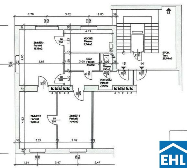 Diese Wohnung befindet sich im 3. Liftstock und unterteilt sich in ein Wohnzimmer, eine Küche, zwei Schlafzimmer, ein Badezimmer, einem separatem WC sowie einen Vorraum.