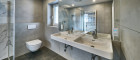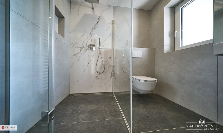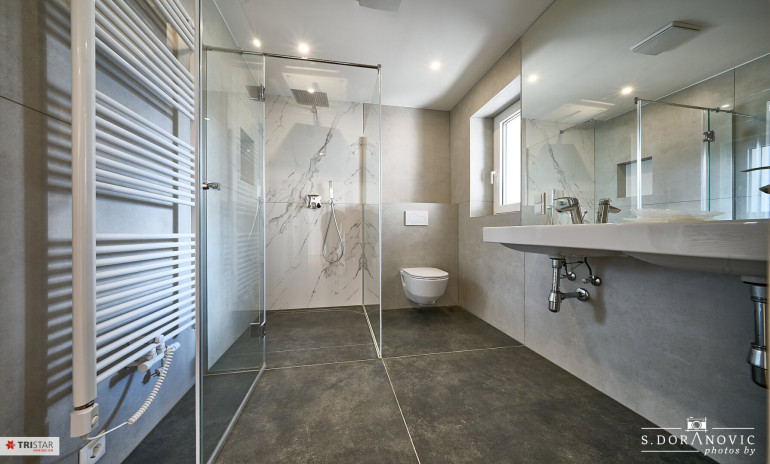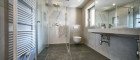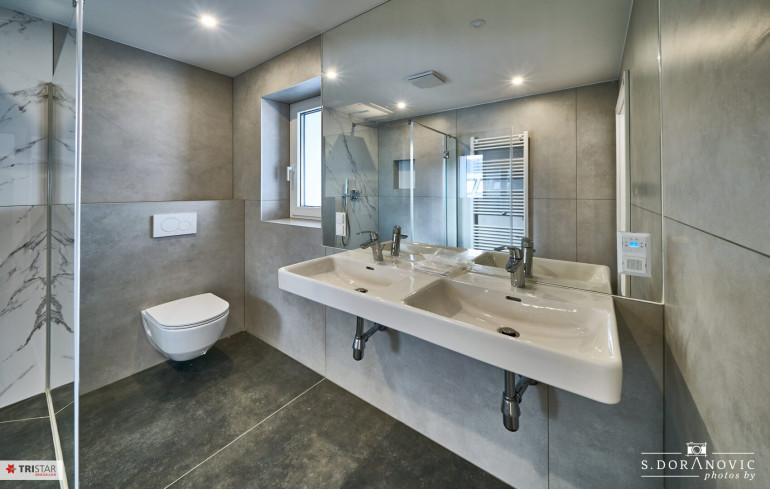 - Sanitär: Fußbodenheizung in Bädern, Wand-WC (Tiefspüler), Handwaschbecken (43x34 cm), Waschtisch (120x46 cm), Chrom-Armaturen, Duschkopf, Mischer, Handbrause.