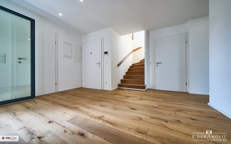 - Sonstiges: Lüftung mit Filtern, Sonnenschutz, WPC-Terrassendielen (dunkelgrau), pulverbeschichtete Geländer, WLAN-Thermostate, Unterputz-Touch-Radio.