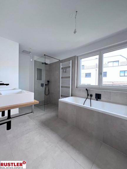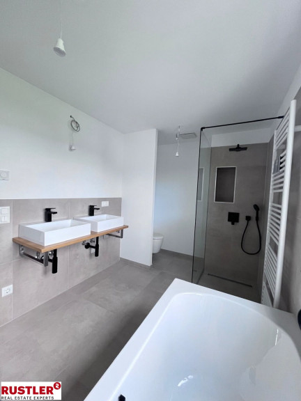 Die Liebe zum Detail zieht sich durch alle Bereiche und basiert auf ausgewählten Materialien und hochwertigen Markenprodukten. Elegante Parkettböden in allen Wohn- und Schlafräumen, Innentüren weiß matt mit Holzzarge bzw. Glastüren, großzügige Terrasse im Erdgeschoß mit Kaltwasseranschluss und Außenbeleuchtung, Terrasse im Dachgeschoß mit beeindruckender Aussicht, großformatige Fliesen (60 x 60 cm) in den Sanitärbereichen, Badewannen mit Markenarmaturen, bodenbündige Duschen, sämtliche Häuser werden vollständig mit Raffstores ausgestattet und noch vieles mehr...