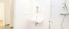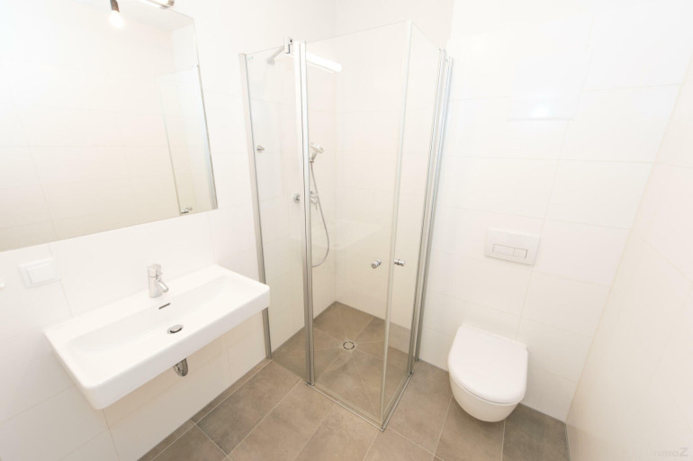 - Badezimmer mit WC, Gästewaschbecken und Go-In-Dusche