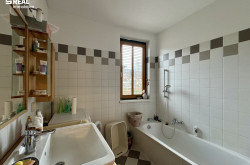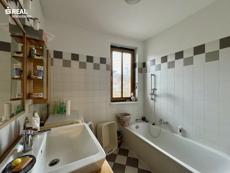 - Badezimmer mit Fenster, Badewanne und Waschmaschinenanschluss