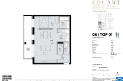 Die Wohnung befindet sich im Erdgeschoss und verfügt über einen Wohnraum mit voll ausgestatteter Küche, ein separat begehbares Schlafzimmer, ein Badezimmer mit Badewanne, ein separates WC, einen Abstellraum mit Waschmaschinenanschluss, sowie einen Vorraum. Die westseitige Loggia lädt zu gemütlichen Stunden im Freien ein.