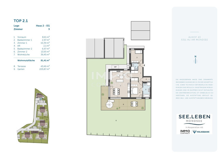 SEE.LEBEN Mondsee liegt in Au, einer der begehrtesten Wohnlagen am Ostufer des Mondsees. Die Kombination aus ruhiger Naturidylle und hervorragender Anbindung macht die Lage einzigartig. In der direkten Umgebung finden sich zahlreiche Freizeitmöglichkeiten – von Wanderungen auf die Drachenwand und den Almkogel über Radtouren durch das Mondseeland bis hin zu kulturellen Angeboten im Salzkammergut. Einkaufsmöglichkeiten, Gastronomie und Schulen sind in wenigen Minuten erreichbar. Der Autobahnanschluss Mondsee ist ca. 20 Minuten entfernt. Von dort erreicht man Salzburg in etwa 40 Minuten, Wien in rund 2,5 Stunden. Auch internationale Erreichbarkeit ist durch den Flughafen Salzburg gewährleistet.Beschreibung der Immobilie