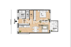 Vom Wohnungseingang gelangt man in die Garderobe mit direktem Zugang zum Badezimmer mit Wanne, zum WC mit Waschbecken und Fenster und zum Wohnbereich. Dieser ist mit einer Einbauküche sowie Platz für Essen und Wohnen ausgestattet. Zudem erfolgt der Zugang zum Schlafzimmer über diese Räumlichkeit. Der Wohnbereich verfügt über Fenstertüren zum Balkon.